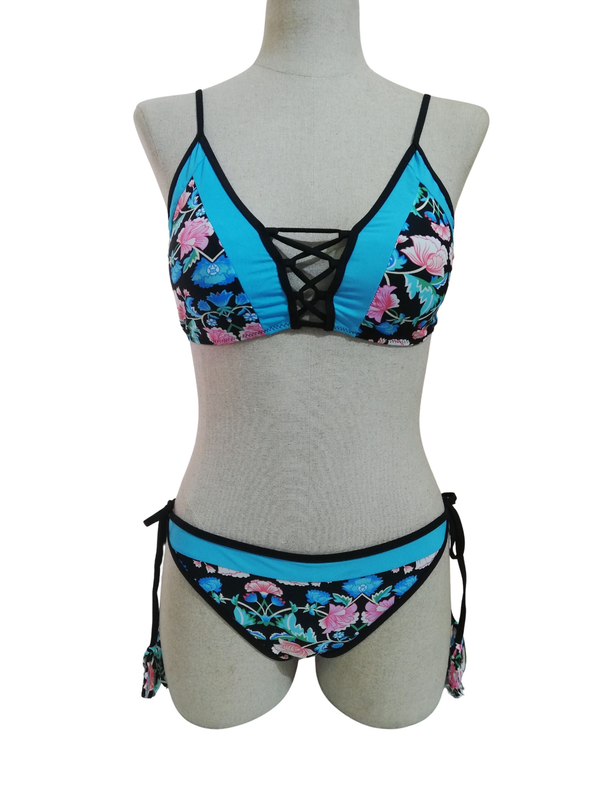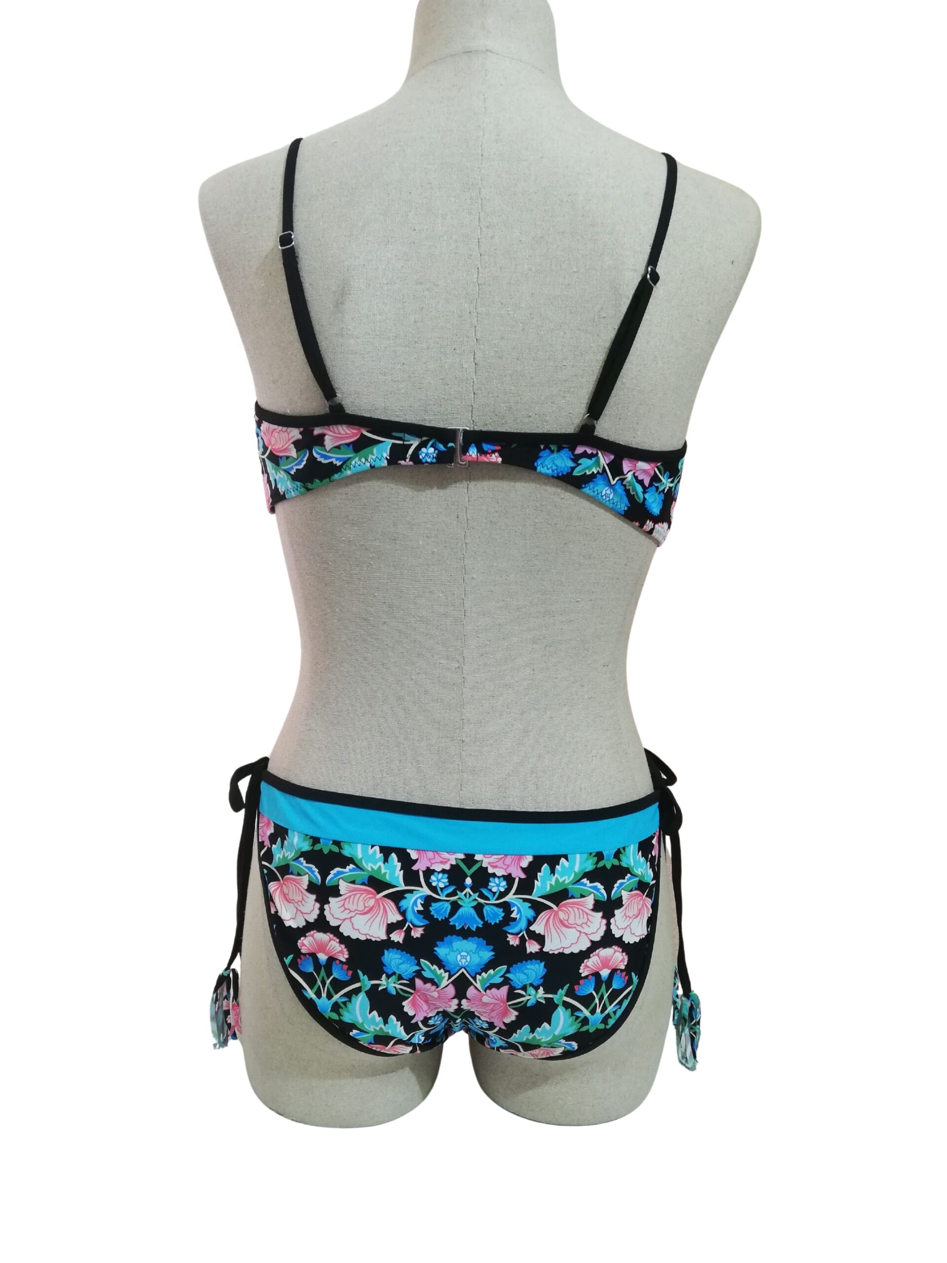 Take in the technicolor rays in this vibrant bikini featuring a top with lace up front, removable padding, contrast piping and print, and matching bottom with side tassel ties and cheeky cut back.