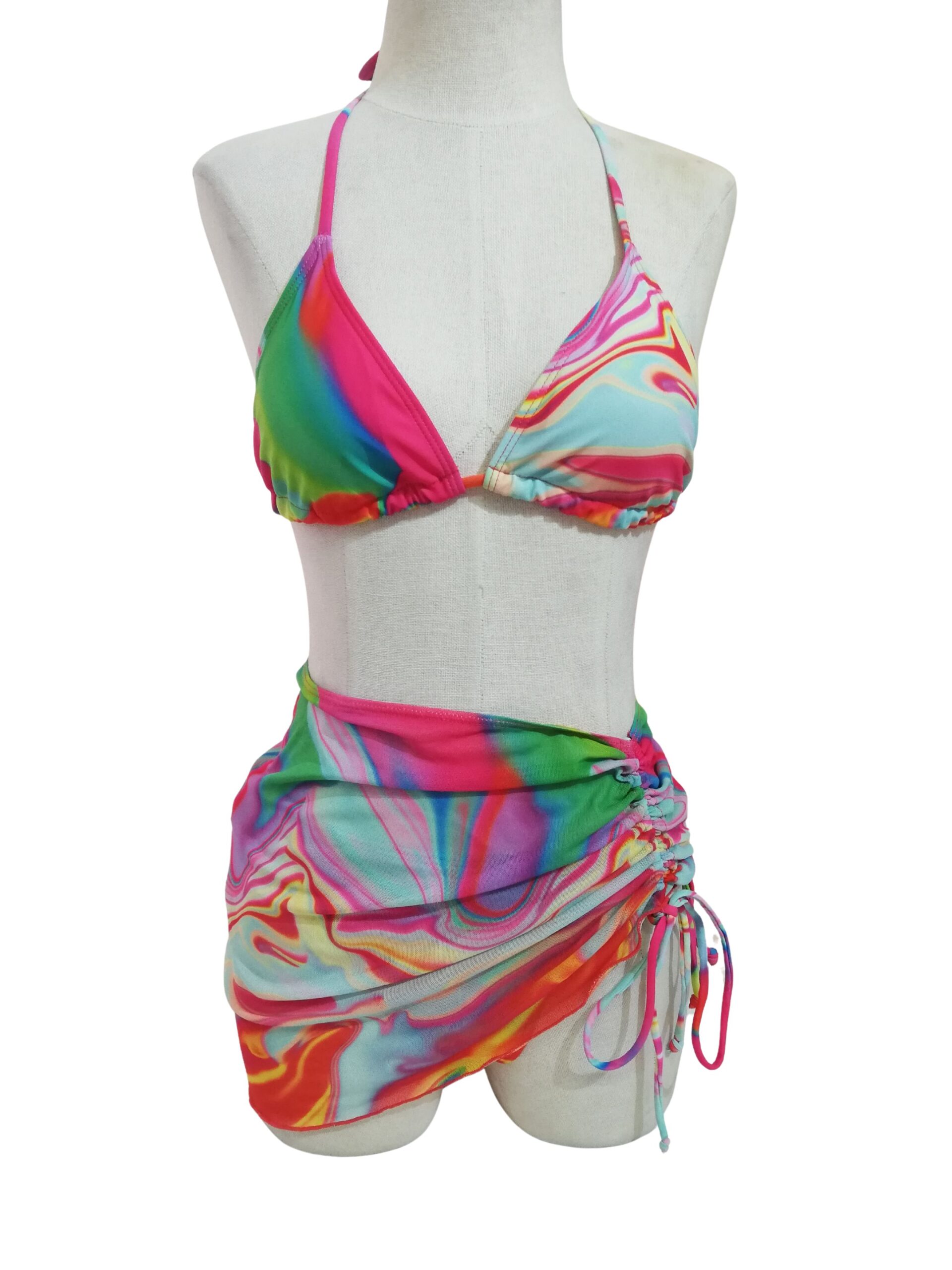 Soak up the sun in this sexy bikini set featuring a triangle cup top with halter straps, tie back closure, an allover swirl design, bottom with side tie closures and a cheeky cut back, and a matching sheer skirt with ruched side tie detailing.