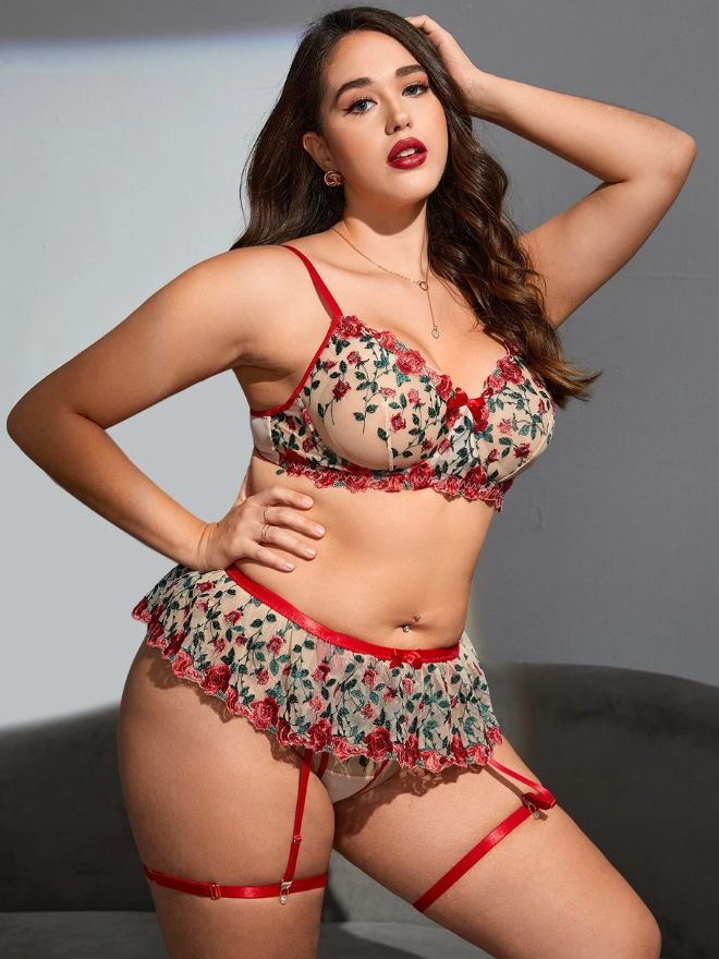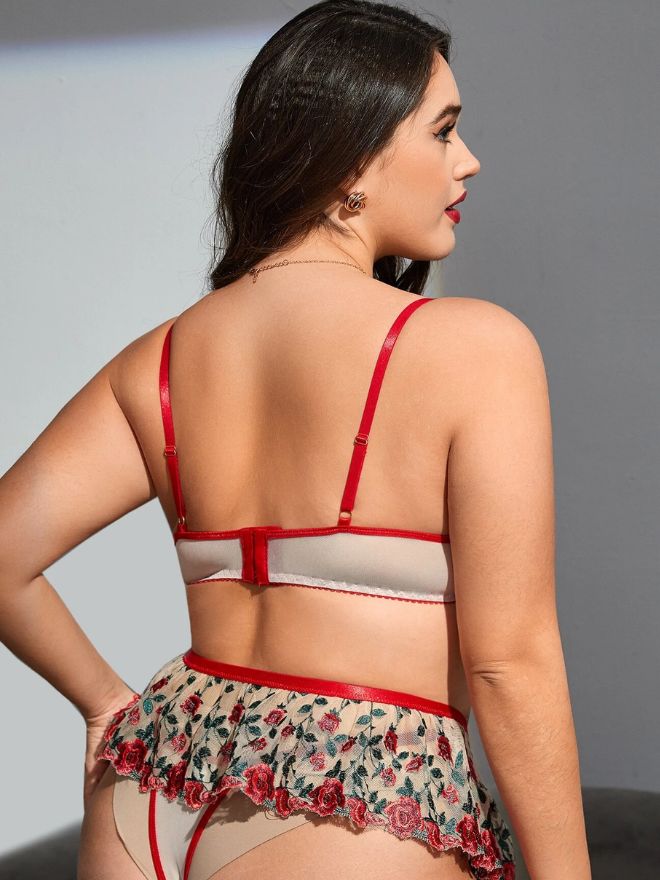 Seduce with floral in this alluring bra set featuring underwire cups with rose embroidery, satin bow, skirted garter belt with elasticated waistband and attached garter straps, wraparound leg garters and matching panty with a thong cut back.