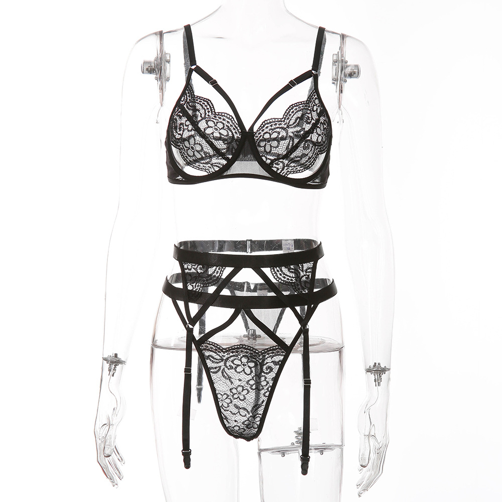 Mesmerize your babe with stunning lace in this bra set featuring sheer underwire cups with underboob peek-a-boos, an adjustable strappy bust, a matching garter belt and a caged lace thong panty.