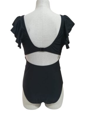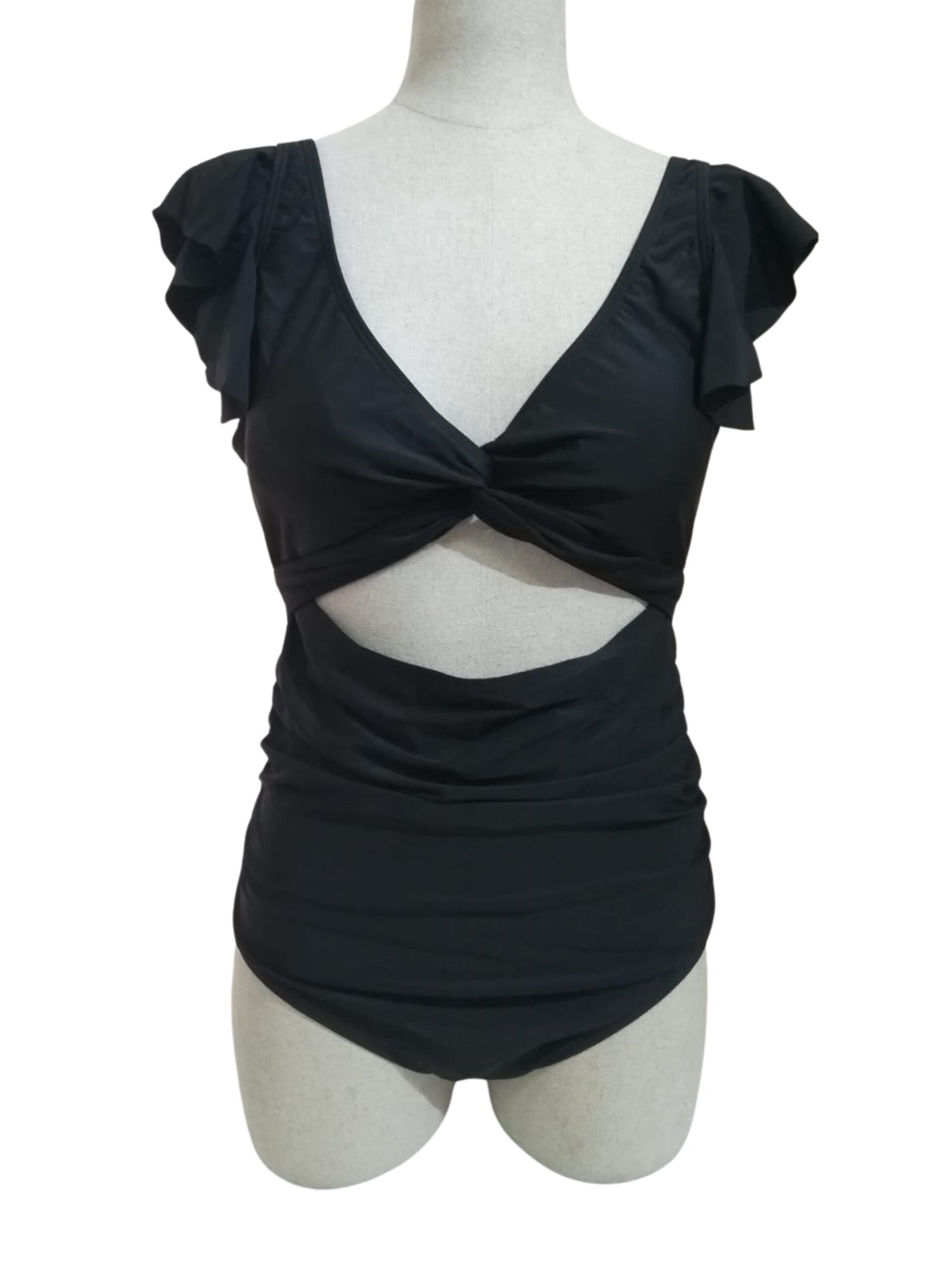 Turn heads on the beach in this elegant one piece swimsuit featuring a v-neckline, flutter cap sleeves, twisted detailing, waistline cutout, ruched bodice, open back and cheeky cut bottom.