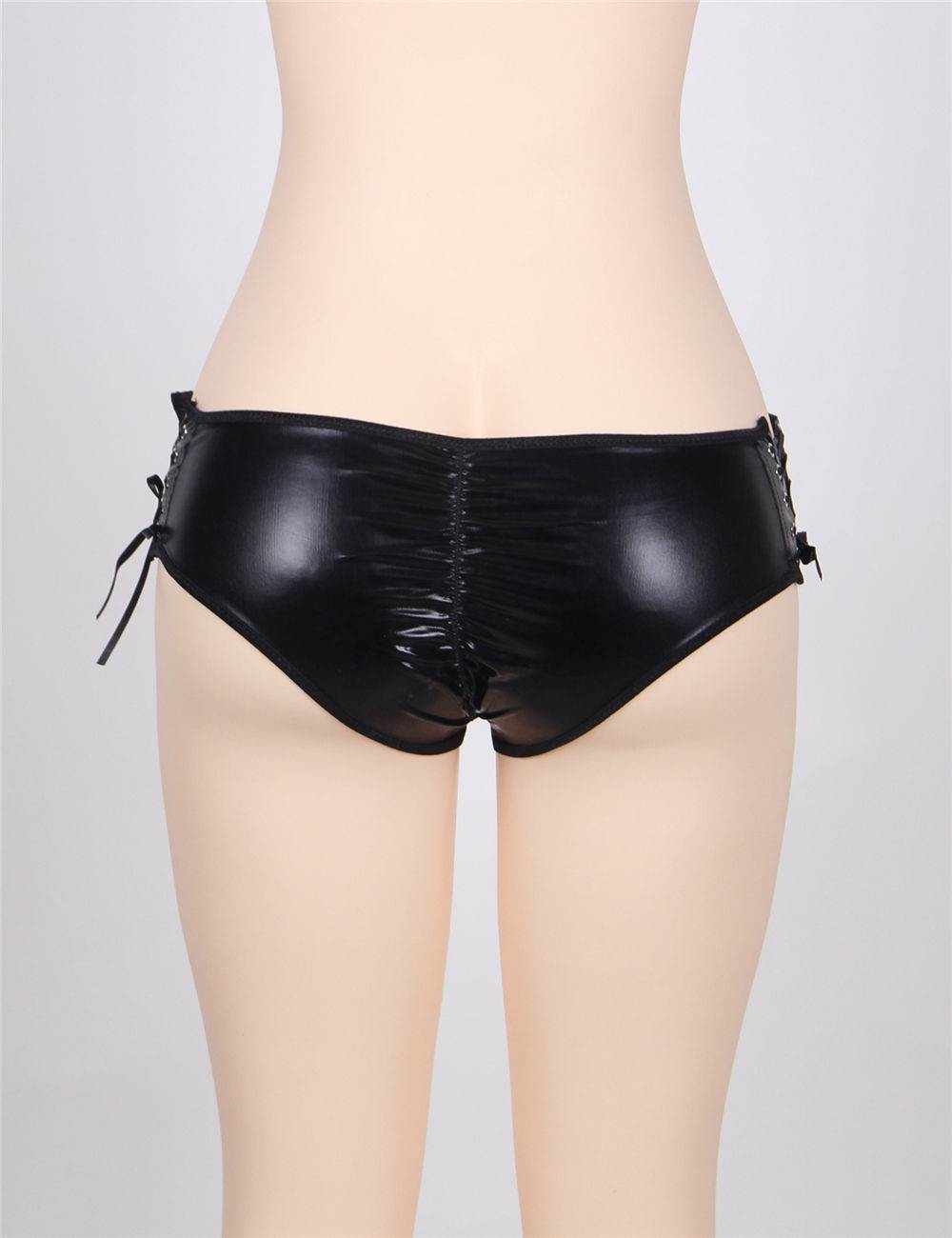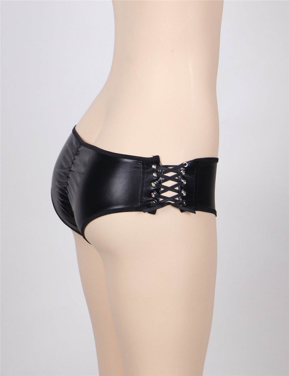 Show your sexy side in this black faux leather wet look boyshort with lace up sides, open crotch and back pucker.